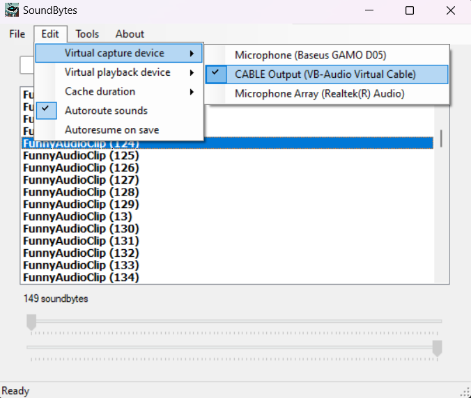 • Select 'CABLE Output' from the 'Edit'->'Virtual Capture Device' menu if it's not already selected and select 'CABLE Input' from the 'Edit'->'Virtual Playback Device' menu