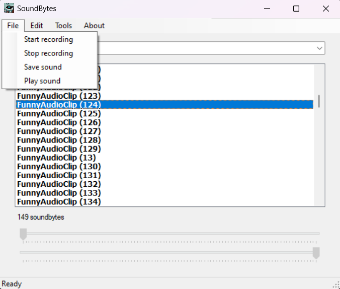 • Trim the audio cache using the start and end trackbars provided at the bottom of the program window. You will hear the trimmed audio each time you change their positions. When you're satisfied with the clip, click 'File'->'Save sound'. A textbox window will popup prompting for a name. Type in a name you want to identify this sound byte with and press Enter.