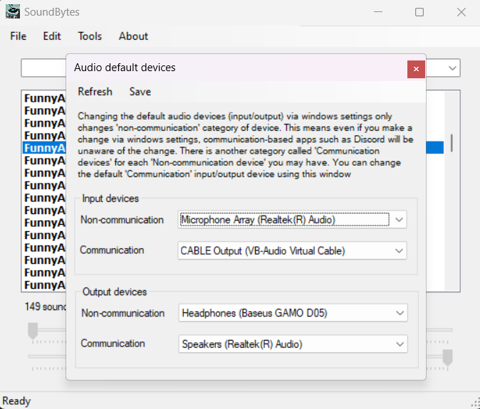 • Select a sound byte from the listbox and click Enter or double-click to play. The sound will be played either to your default playback device (speaker) or the virtual playback device you specified from the 'Edit' menu depending on if you left the 'Edit'->'Autoroute sounds' menu unchecked or checked it. If you want to route the sound byte you play to an app such as Discord, you'll want to set its Input Device to 'Default' since SoundBytes sets the default input device of the system to the one you selected from the 'Edit'->'Virtual Capture Device' for the duration of its runtime